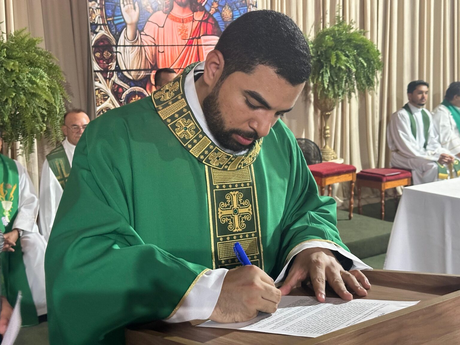 No início da celebração, Dom Plínio entregou a estola ao sacerdote e afirmou que “a estola confere ao sacerdote o poder de servir ao povo de Deus na Igreja em nome de Cristo”.
